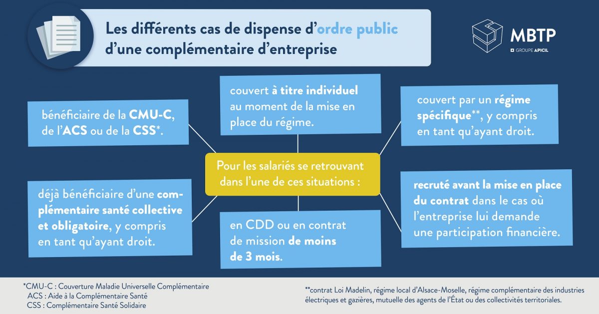 Il existe 6 cas dans lesquels le salarié est dispensé de plein droit de souscrire la complémentaire santé d’entreprise :